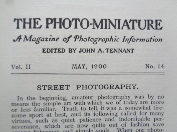 Volume 2 Number 14. May 1900. Soft cover. 8in x 5in. "Street Photography" issue. 69 pages including several pages of ads. Numerous photographs.