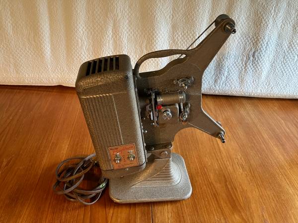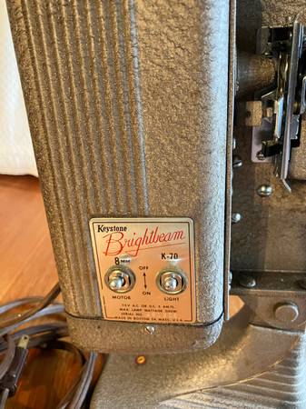 Vintage 1950s Keystone Brightbeam K70 model 8mm movie projector. Projection bulb works; motor/fan works but needs lubrication. Also includes two empty 7" takeup reel.