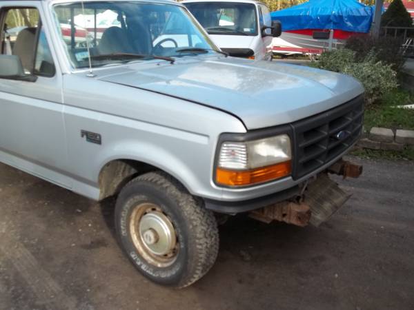 1996 F-150 PARTS 4x4 Truck. selling for parts. has 83,000 on it motor runs great. truck has BAD FRAME, for sell is hood, radiator ,Tranny and transfer case, passenger fender, cab, doors, box and tailgate, new front and rear bumpers, grill, and head lights, ladler rack, nice seat, good rear end, call for prices $100.00 or B/O call 585-787-one six four six please leave name and number I will call back asap. Harry Thanks. No emails please. UPDATE DRIVER SIDE FENDER AND TIRES SOLD AND MOTOR SOLD.TRANNY AND TRANSFER CASE SOLD.
