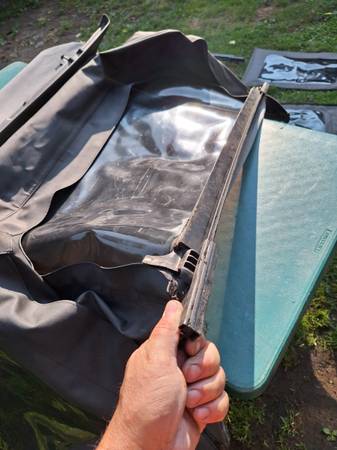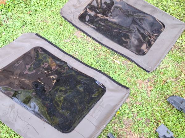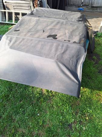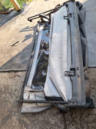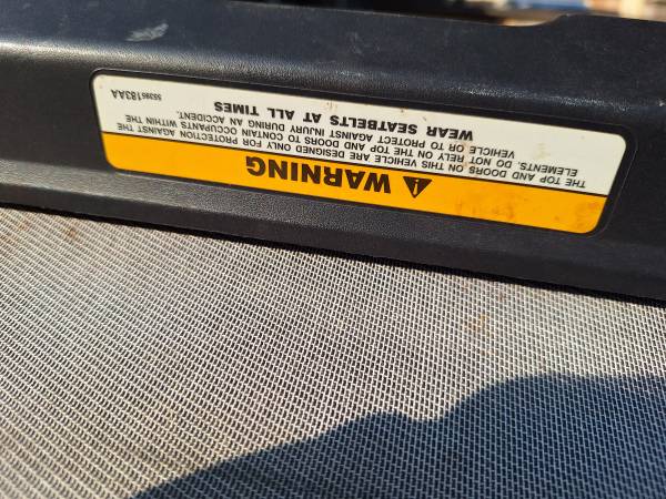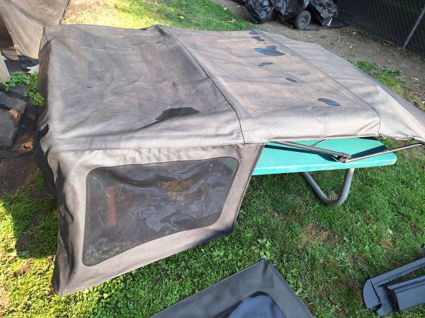 Used soft top with supporting frame. Includes the 2 extra side tinted windows, also plastic window surrounds, and other trim pieces (PICS) The rear window is intact, Vinyl is free of any major rips or tears. Stitching is fully intact with no fraying. All Zippers are good, The Top has general sun fading and discoloration throughout the upper portions. Support frame it's good and folds back, Includes everything as shown in the photos. You may need to reuse some existing hardware for installation.