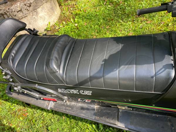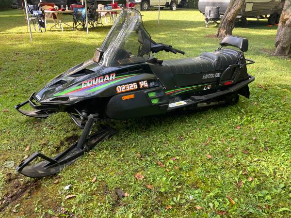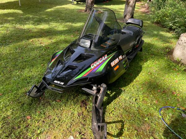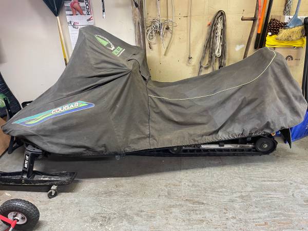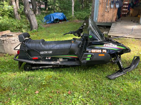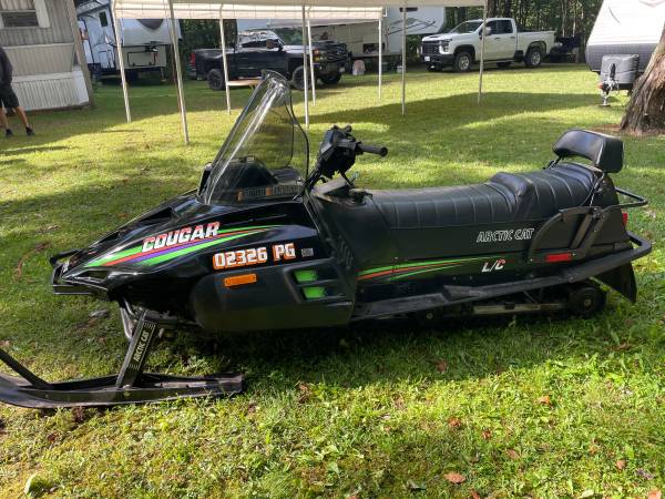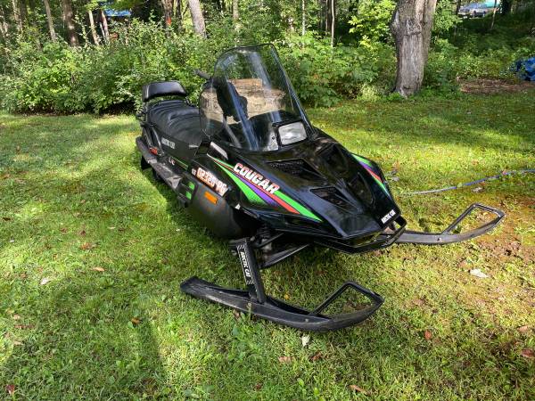 One owner sled. Only ridden in Tug Hill and never trailered back and forth. Snowmobile is presently in Redfield NY. Can be brought to Rochester for serious buyer. This is called a Cougar Mountain Cat with the longer rear suspension. Two up seat installed with the addition leaf springs to handle two riders. Reverse is also an added convenience. We have the original single seat as well and is in perfect condition. Engine is the 440 liquid cooled Spirit model. (Suzuki). Includes custom fit Arctic Cat cover.