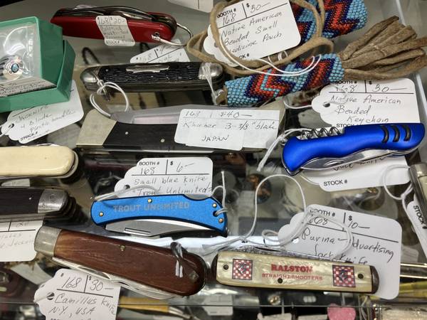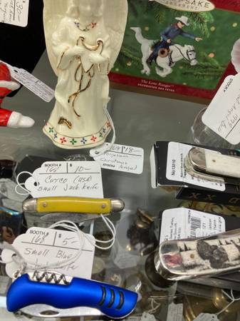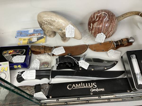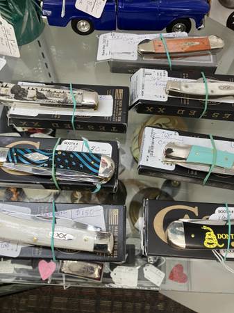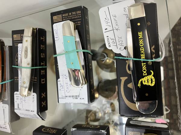 Collection of knives: Vintage and a selection of advertising knives; hunting knives, jack knives- and fixed- blade knives with sheaths -various sizes and conditions, and machetes, and makers, including: several collectable CASE knives with original boxes- in excellant, like- new condition, Case " Dont Tread on Me" trapper pocket knife,! ( Case knives are 1/2 the price compared to the internet,,) Barlow, Camillus, Smith and Wesson, Winchester, Colonials, Kingston, Hammer, Rostfrei, Germany, Ireland, etc.Some new in box. Nice German Bull jackknife... Nascar Knife. Machetes. Large selection of gift worthy knives new in boxes.**various ages, prices and conditions (**prices from $5.-$200. May be easily seen in my case #168 at Henrietta Mall Antiques. 975 Jefferson Rd., Open daily from 10am-6pm. **Note: I am having a 25% off sale on all items over $10. *** ...Collectible Case knives are here!!! They are like new- in original boxes. (Thank you for all the inquireries!) Just added: hunting knives with cases. And Special Forces survival knife.