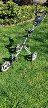 Bag Boy Golf Cart. Has beverage holder and umbrella holder. Quick and easy disassembly to fit in your car. $60.00