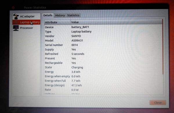 Battery holds charge for about 20 minutes, enough to move laptop around the house w/out shutting it down