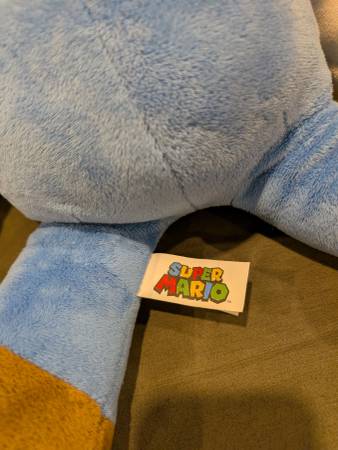 Large Super Mario plush stands approximately 24 inches tall. Labeled Super Mario, 2018 Nintendo. Large Red mushroom Mario Kart sits approximately 14 inches tall. Labeled Club Mocchi-Mocchi, Tomy....