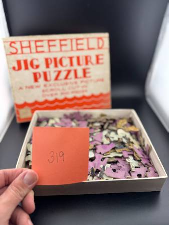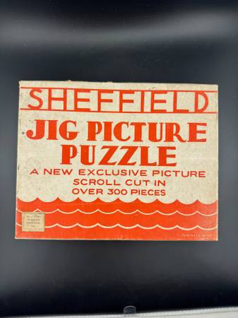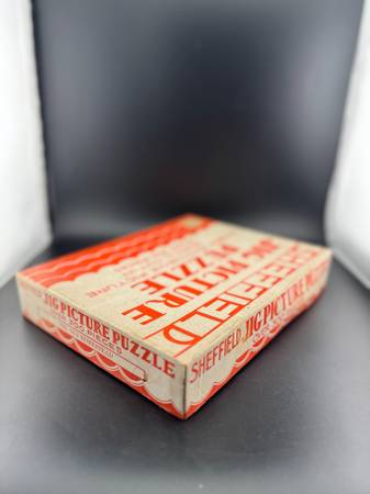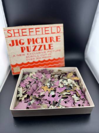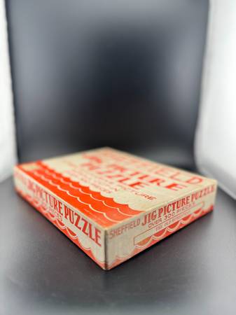 A vintage Sheffield Jig Picture Puzzle featuring a scroll cut design with over 300 pieces. Perfect for puzzle enthusiasts, this unique game offers a nostalgic challenge and a glimpse into mid-century children's toys. Please note - Vintage puzzle pieces have been counted and noted. We have only listed those puzzles with pieces that fall into the range noted on the box. Puzzles have not been assembled to verify they're complete.