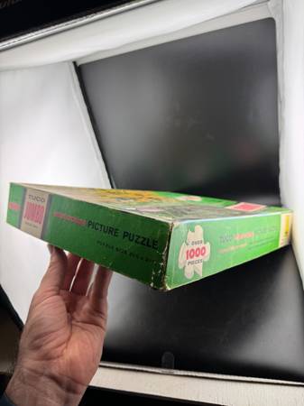 A relaxing countryside scene is captured in this jumbo puzzle, featuring over 1000 interlocking pieces. Perfect for a weekend activity, this puzzle depicts lush green fields, a charming farmhouse, and working horses. Its triple-thick, durable design ensures years of enjoyment as you piece together picturesque farm life. Please note - Vintage puzzle pieces have been counted and noted. We have only listed those puzzles with pieces that fall into the range noted on the box. Puzzles have not been assembled to verify they're complete.