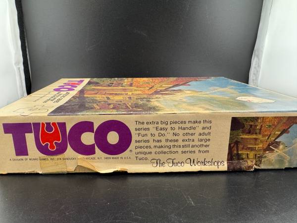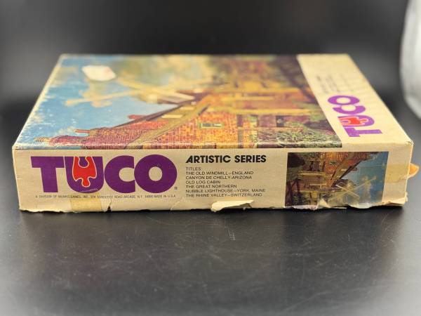 This vintage TUCO puzzle features a picturesque windmill scene, titled "The Old Windmill." A great choice for relaxation or a creative project on a quiet afternoon. Enjoy piecing together this nostalgic depiction of traditional windmill scenery. Please note - Vintage puzzle pieces have been counted and noted. We have only listed those puzzles with pieces that fall into the range noted on the box. Puzzles have not been assembled to verify they're complete.