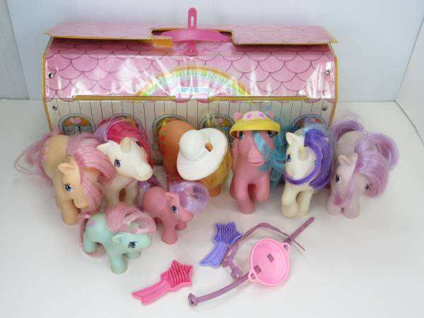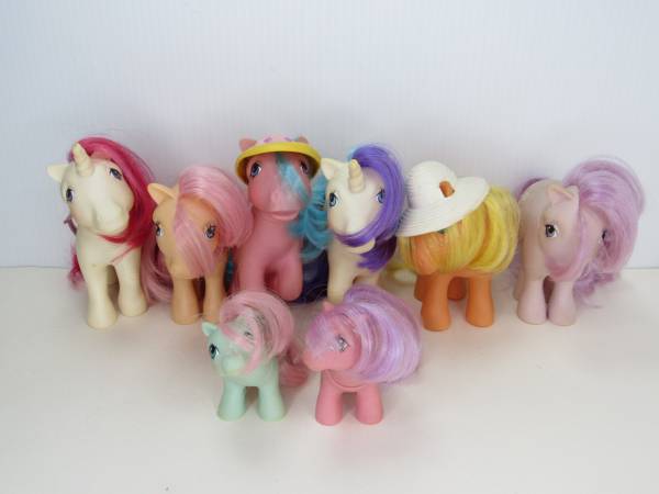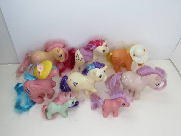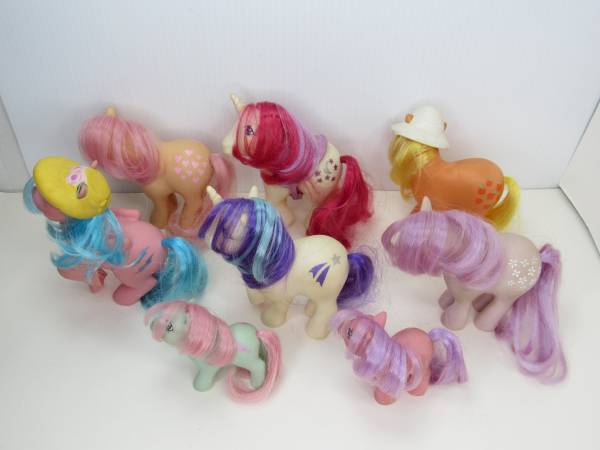 They are used and in good vintage shape with just some normal use and age wear. The larger ponies are all from 1982 or 1983. The smaller ponies are from 1985 and 1986. The carry case has a broken top handle (see pictures). Not looking to separate.