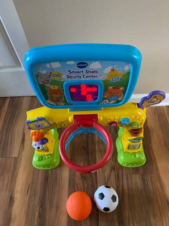 This electronic sports center features a soccer net and basketball hoop for a fun 2-in-1 play experience.