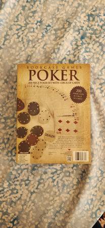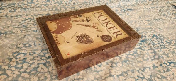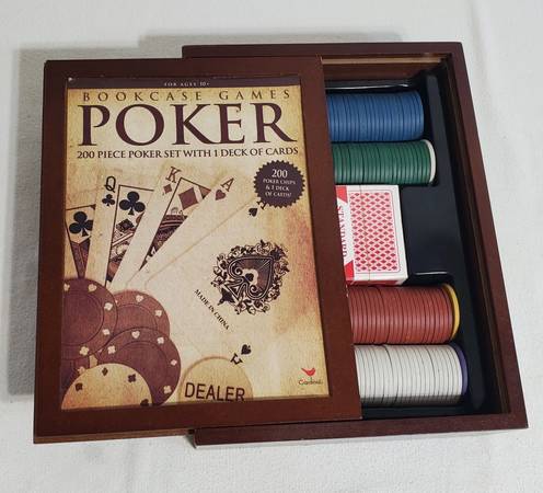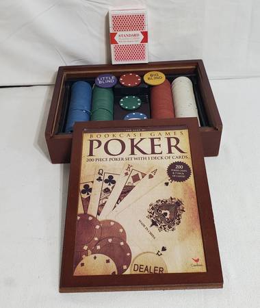 New Bookcase Games "POKER" 200 Piece Poker Set with 1 Deck of Cards 200 Pokers Chips Wooden Storage Case (2 photos borrowed from internet to show contents - mine is sealed)