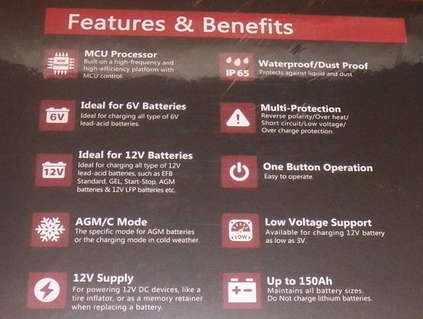 CHARGING PEAK CURRENT--It supplies 6A current for charging up to 150AH 12V lead-acid batteries, and 2A current for up to 30AH 6V lead-acid batteries.
