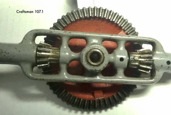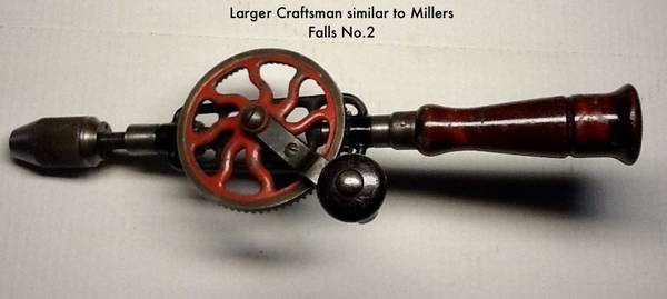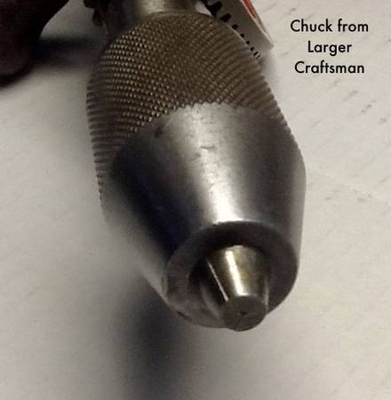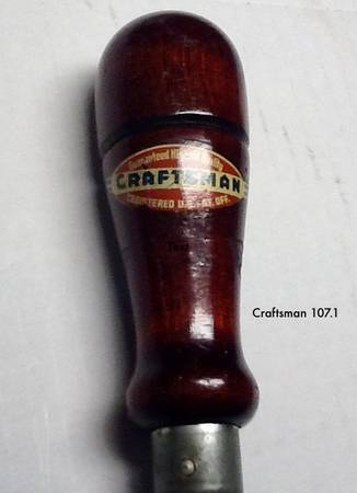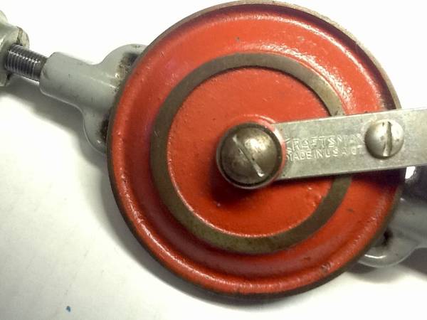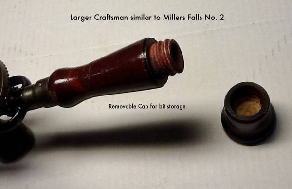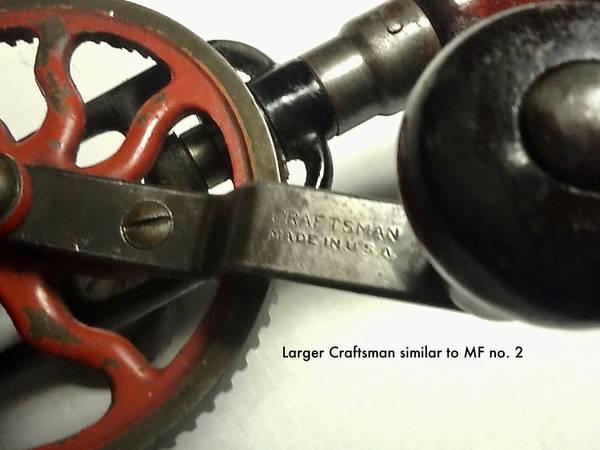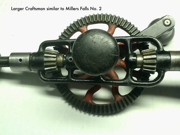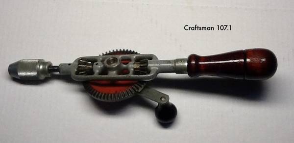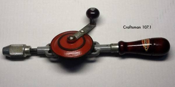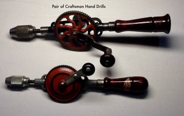 A pair of Craftsman Hand Drills. The smaller of the two (about 12" long) is model No. 107.1. The larger (about 14 1/2" long) is very similar to a Millers Falls No. 2. (Millers Falls made drills for Craftsman) Both are in nice condition and ready to go to work. The mechanisms (Double Pinion) are smooth and the chucks are in nice shape. The chuck capacity of the 107.1 is 1/4". The chuck capacity for the larger drill is 3/8". Both handles have screw on caps for drill bit storage. I am asking $20 each or both for $35.