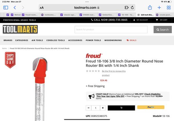 Freud 18-106 3/8” round nose bit (Ace packaging) - $10