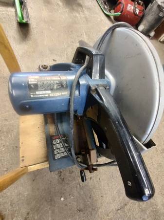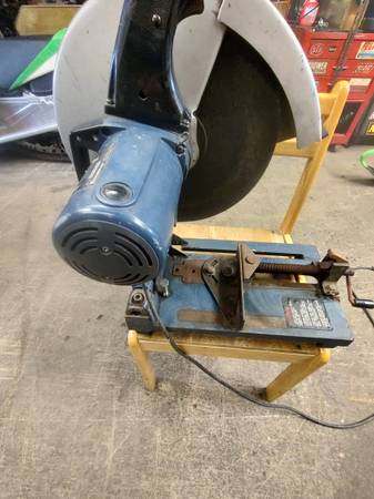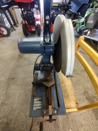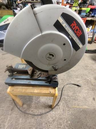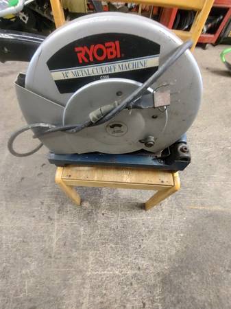 Ryobi 14" Metal Cut off saw with cast iron table. Purchased this yrs ago to build a trailer. Now decided to sell it, because do not use it anymore. This has a cast iron table on it, not the cheap tin tables that they use on them now. This also has a built in vise angle and can cut angles 0 to 45 degree. This is heavy duty saw and weighs 46 pounds. I pd 299.95 for it when purchased it yrs ago. Needs nothing but a good cleaning from setting around. Also have the owners manual and parts book and tools to change the wheels. This hasn't had a lot of use. First 150 takes this.