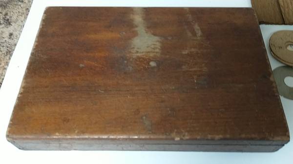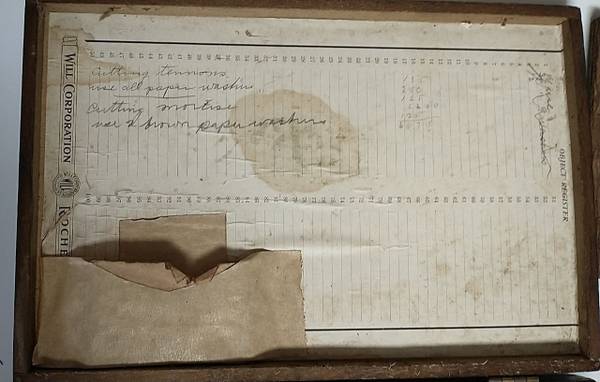 Solid wood hinged lid box which measures approx. 11" wide, 7 1/4" deep, 1 1/2" high. Sheet inside box says "Object Register", "Will Corporation Rochester, NY"