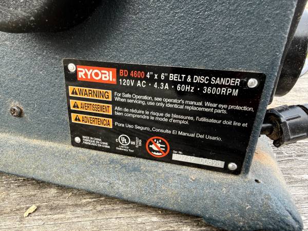 RYOBI BD4600 4 x 6 inch Belt and Disc Sander $125 WILL NOT REPLY TO ANY EMAILS UNLESS YOU INCLUDE A PHONE NUMBER THANKS
