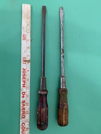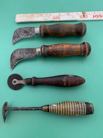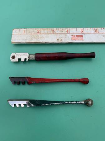 ALL FOR $50 or as Priced. Linoleum Knives with Steel Blade (2) $10 Gough and Screen Presser (2) Vintage $10 Cast Iron Wood or Coal Cook Stove Lid Lifters (2), 8 1/2" Long, Vintage $20 Glass Cutters...
