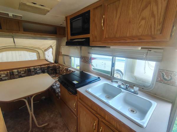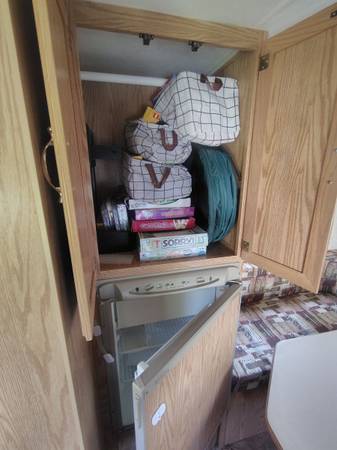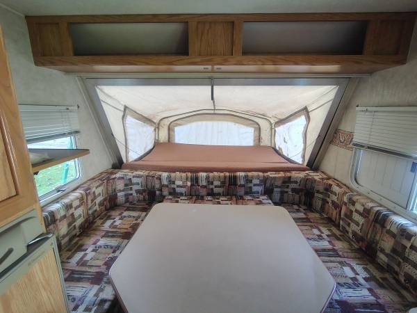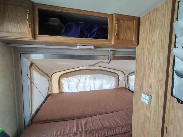 Has a twin and king size pop out beds. Table folds down to a full size bed. The king side was completely redone this past May. All caulking was also redone this past May. Has water damage from the previous owner. Leak causing the water damage has been repaired and roof was just resealed. Only reason for selling is because we upgraded unexpectedly. The camper is already winterized. It comes with the hitch and sway bars.