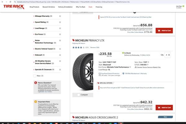 245/70/17 MICHELIN Primacy LTX $110 All Four - $110 (Geneseo)
