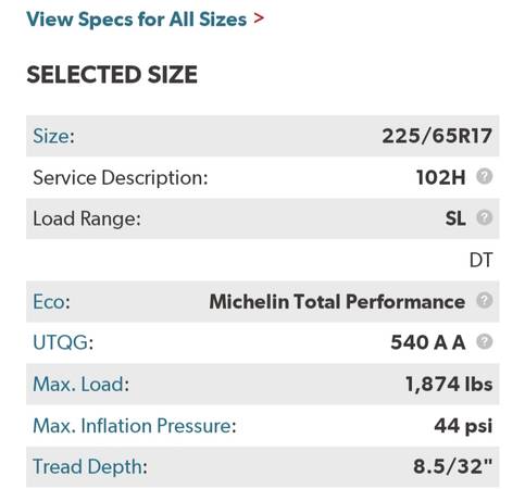 2 - Michelin 225/65/17 Premier LTX All Season tires - $85