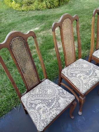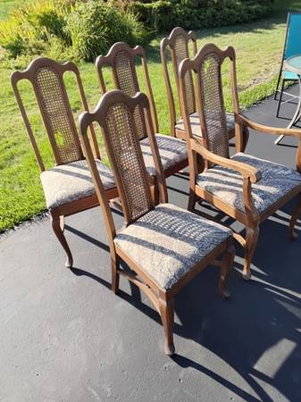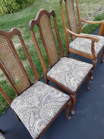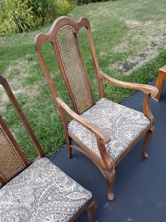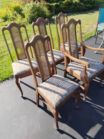 5 chairs (probably mahogany ) - includes captains chair, all are solid chairs, sturdy, ready to use, NEW SEATS, caining is solid, 2 chairs are perfect conditon - the cain on 2 need a little work, captains chair's back needs some recondition, is SOLID though - chairs can be used right away, could deliver ! Beautiful chairs for more generations to come.