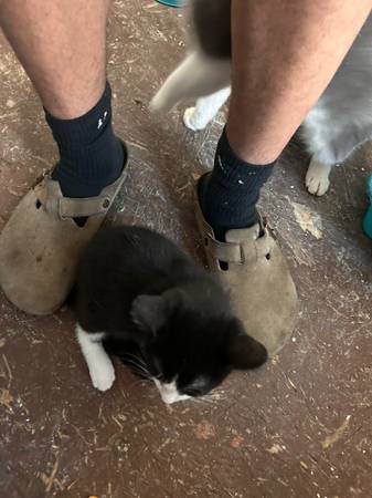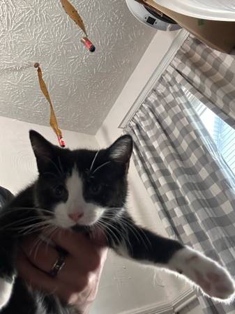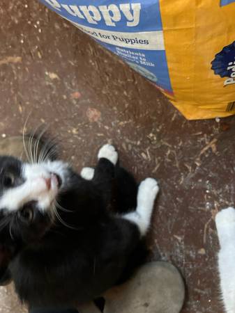 Wonderful tuxed lady that loves cuddles and pets litter trained and eating dry food