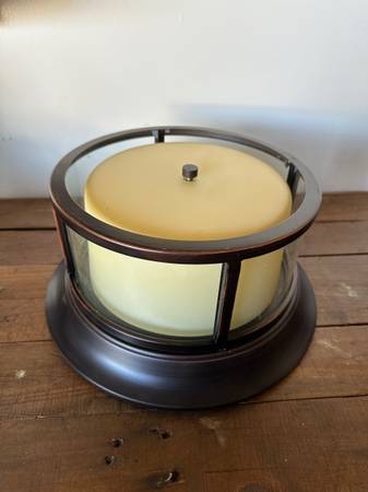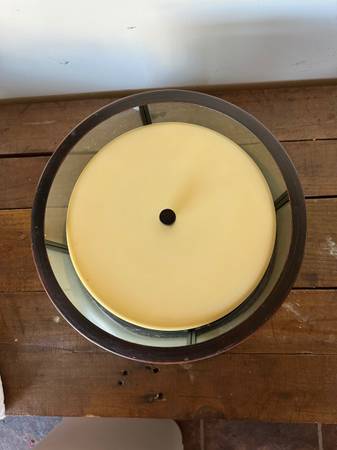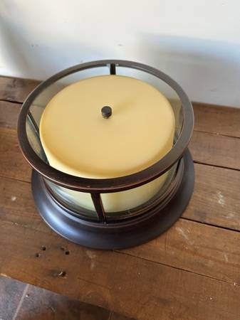 Flush mount ceiling light. Hold 2 light bulbs. 13” diameter at ceiling. 6 3/8” tall. Mounting bracket included.